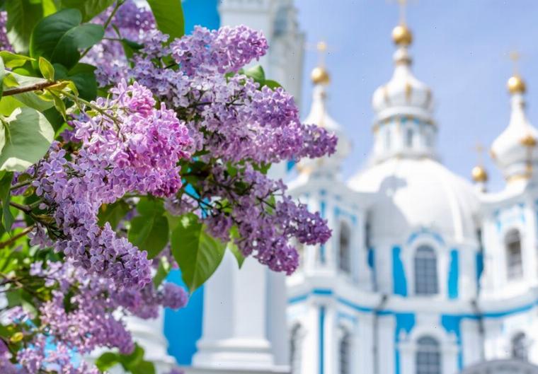 В период белых ночей к Смольному монастырю, к его роскошному собору и флигелям, утопающим в деревьях сирени. Совершенно невероятная картина, где воздух напоен тонким ароматом этих дивных, изысканных цветов.