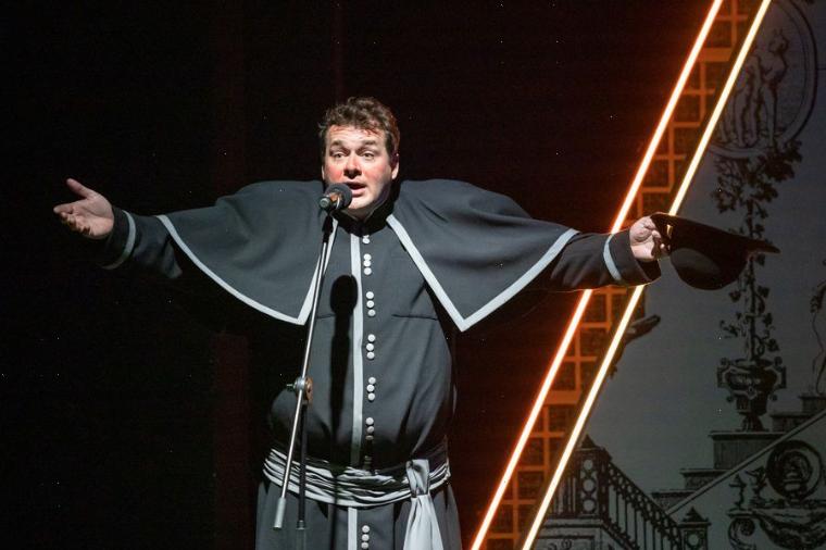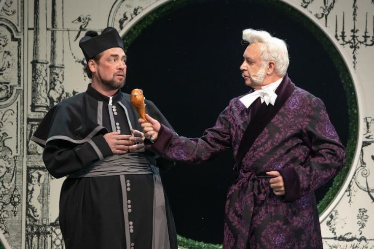 Итак, юные Альфред и Камилла, получив образование, должны одновременно вернуться в родной замок и встретиться в праздничной обстановке. Барон в спектакле показан уморительно щепетильным приверженцем порядка и гармонии, которого оскорбляет даже цветок, если на его вкус он недостаточно красив. Хозяин замка продумал торжественный миг встречи до мелочей и не выпускает из рук мини-макет с декорациями и фигурками.