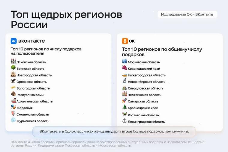 ВКонтакте и Одноклассники проанализировали данные об отправленных виртуальных подарках и назвали самые щедрые регионы России. Лидерами стали Псковская и Московская области.